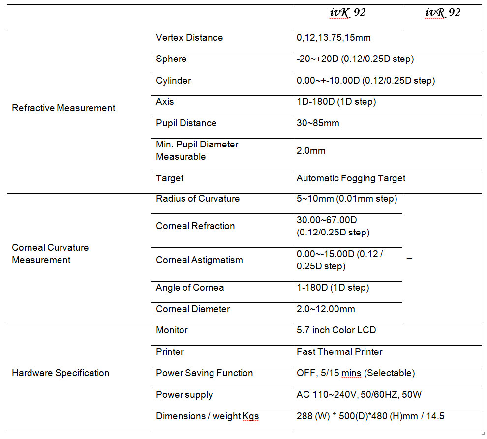- With Corneal curvature and diopter measurement function (ivK 92)